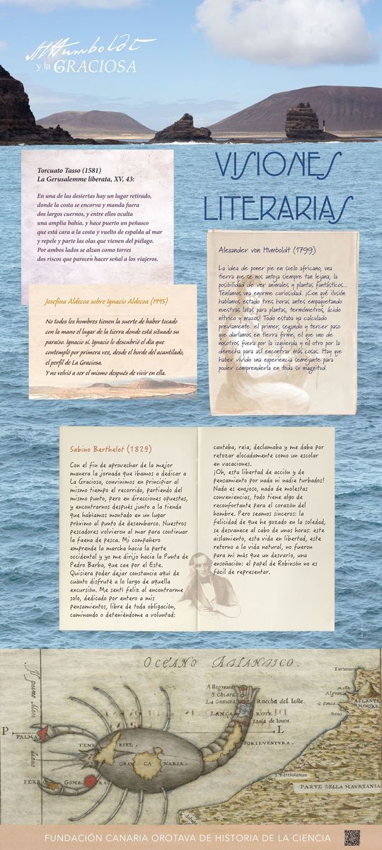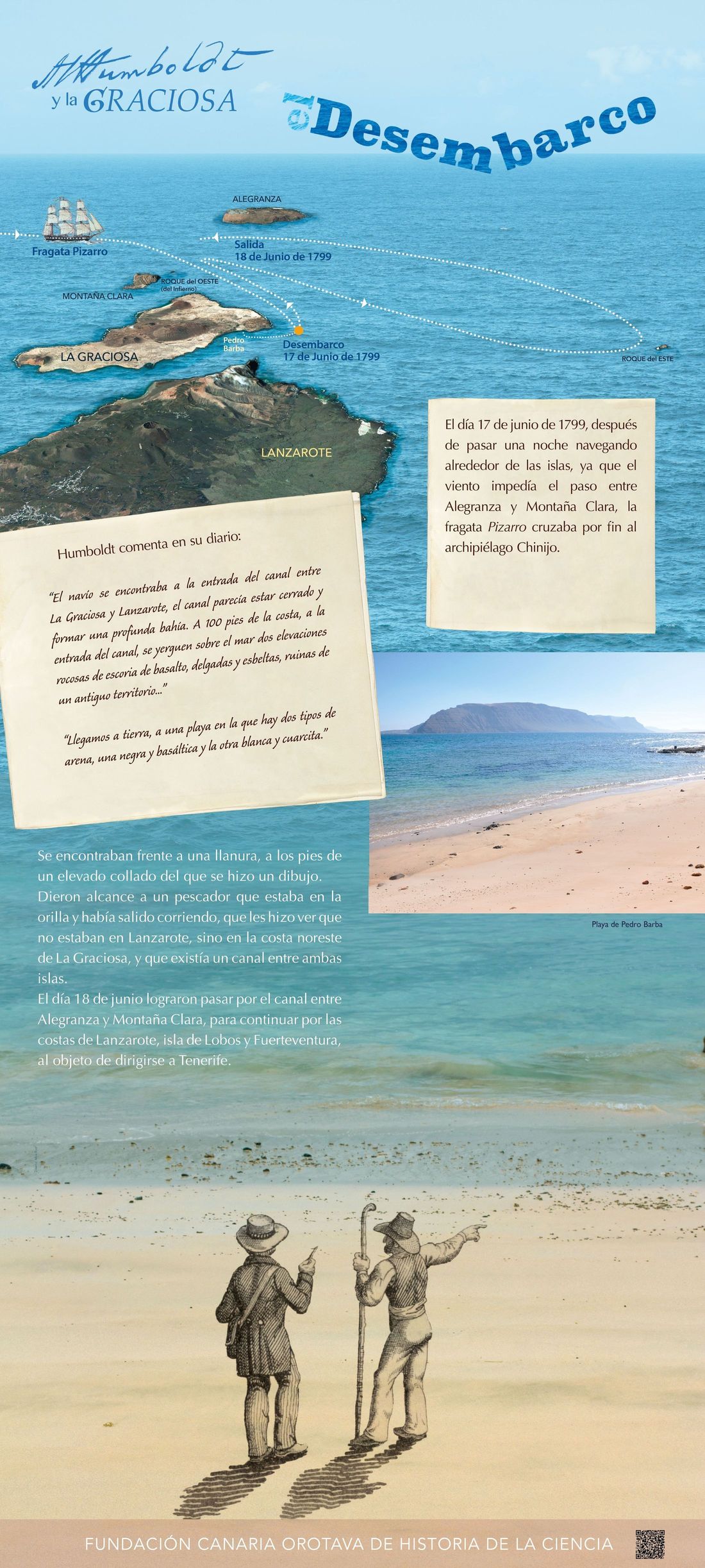 En la primera parte de la exposición se relata someramente la historia de La Graciosa, el viaje de Humboldt en la fragata Pizarro, su desembarco en la isla y algunos textos literarios sobre ésta.