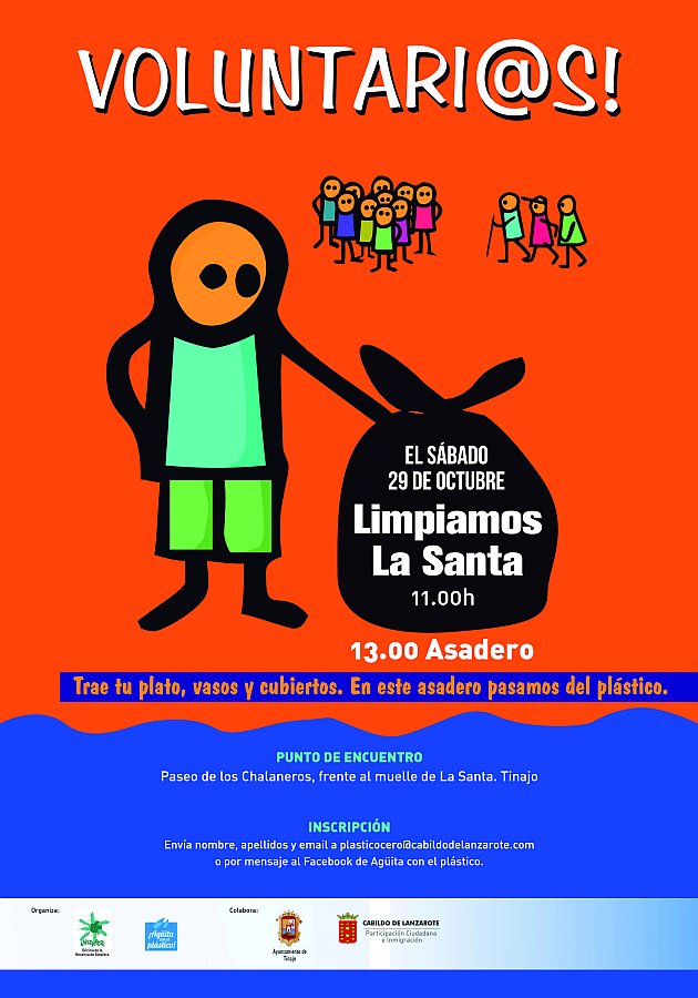 Las personas que quieran participar como voluntarias pueden inscribirse a través del correo electrónico plasticocero@cabildodelanzarote.com o enviando un mensaje al facebook de ‘Agüita con el Plástico’ El punto de encuentro será el ‘Paseo de los chalaneros’, frente al muelle de La Santa, y los participantes disfrutarán de un asadero para lo que se les invita a que lleven sus propios cubiertos, vasos y platos desde casa, evitando el uso de vajillas de plástico y la generación de residuos.