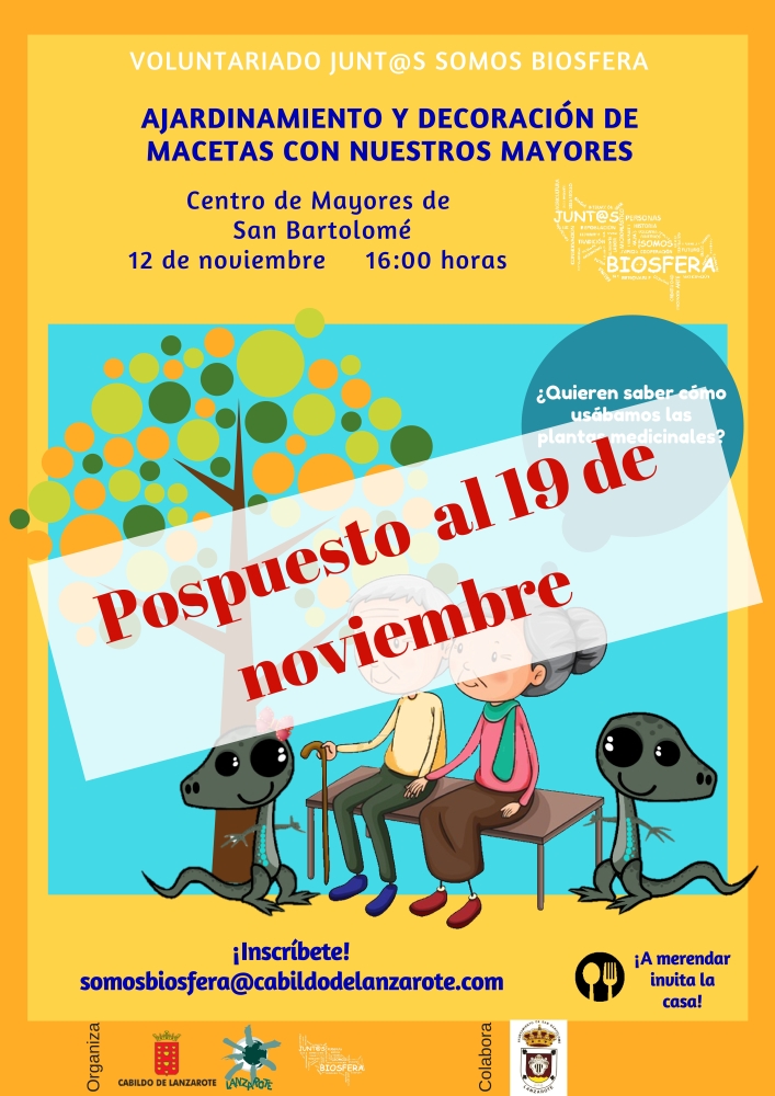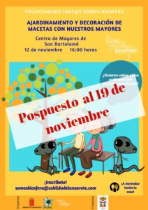 La actividad de voluntariado que Junt@s Somos Biosfera, dependiente de la Oficina de la Reserva de la Biosfera del Cabildo de Lanzarote, tenía previsto desarrollar el 12 de noviembre en San Bartolomé bajo el epígrafe ‘Ajardinamiento y decoración de macetas con nuestros mayores’, se ha aplazado al domingo 19 de noviembre.