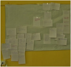Tal como se acordó en este mismo taller, las propuestas fueron sintetizadas (puesto que habían propuestas similares) quedándose finalmente en 26 posibles acciones. Estas se organizaron en ocho bloques temáticos.