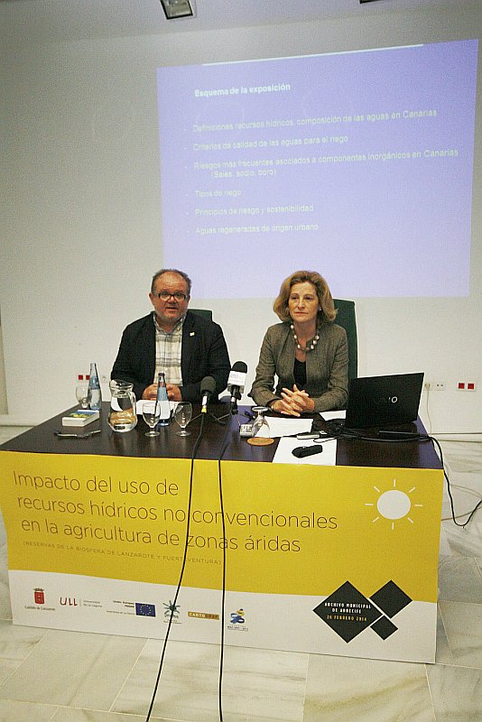 El encargado de dar a conocer los resultados del citado estudio, elaborado por la Univesidad de Laguna a petición de la Oficina Reserva de la Biosfera del Cabildo en el año 2010, fue Francisco Díaz Peña, investigador del Programa Ramón y Cajal. Durante la exposición, Díaz expuso las conclusiones del estudio centrado en el impacto del riego con recursos hídricos no convencionales en los enarenados de Lanzarote. Centró la atención Díaz Peña en las peculiaridades del sistema tradicional agrícola de Lanzarote, basado en enarenados. Tras dos años de análisis químicos y microbiológicos del agua de riego se concluye que las aguas desalinazadas de Lanzarote presentan un grado de restricción para el uso agrícola de ligero a moderado, pues pueden plantearse algunos problemas potenciales de reducción de la permeabilidad del suelos por la combinación de los valores de salinidad y de relación de adsorción de Sodio. De lo que se puede concluir que el riego ha provocado una degradación moderada en los suelos enarenados de Lanzarote.
