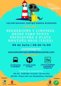 El Cabildo de Lanzarote llevará a cabo el próximo 9 de julio, a través de la campaña ‘Agüita con el Plástico’ y dentro de las acciones enmarcadas en la línea de trabajo ‘Juntos somos Biosfera’ de la Oficina de la Reserva de la Biosfera, una actividad de voluntariado que transcurrirá entre el Faro de Punta de Pechiguera y la playa de Montaña Roja, y que contará con la colaboración del Ayuntamiento de Yaiza y Senderismo Lanzarote.
