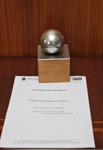 La obra ganadora, denominada ‘Estabilidad‘, es una esfera de aluminio soportada por su propio peso, sin ningún tipo de soporte, sobre una base también de aluminio y madera que hace las veces de caja y base para reposar esta original escultura que está llena de significado y movimiento.