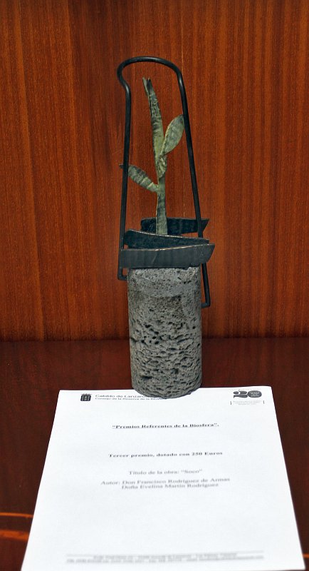 Por último, el tercer premio, dotado con 250 euros, ha sido para la obra ‘Soco‘ de Evelina Martín Rodríguez, Francisco Rodríguez de Armas y Ventura Alemán Gutiérrez. Los coaturores de la obra describen la misma como «una pieza que presenta una línea que protege a un brote vegetal». Esta línea dicen que representa a la vez «al volcán y a los socos de defensa del viento para la agricultura, tan definitorios del paisaje agrícola de Lanzarote, como símbolo de protección”.
