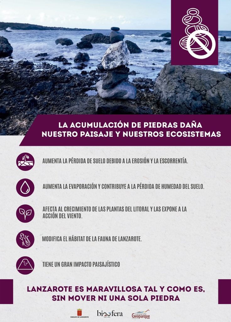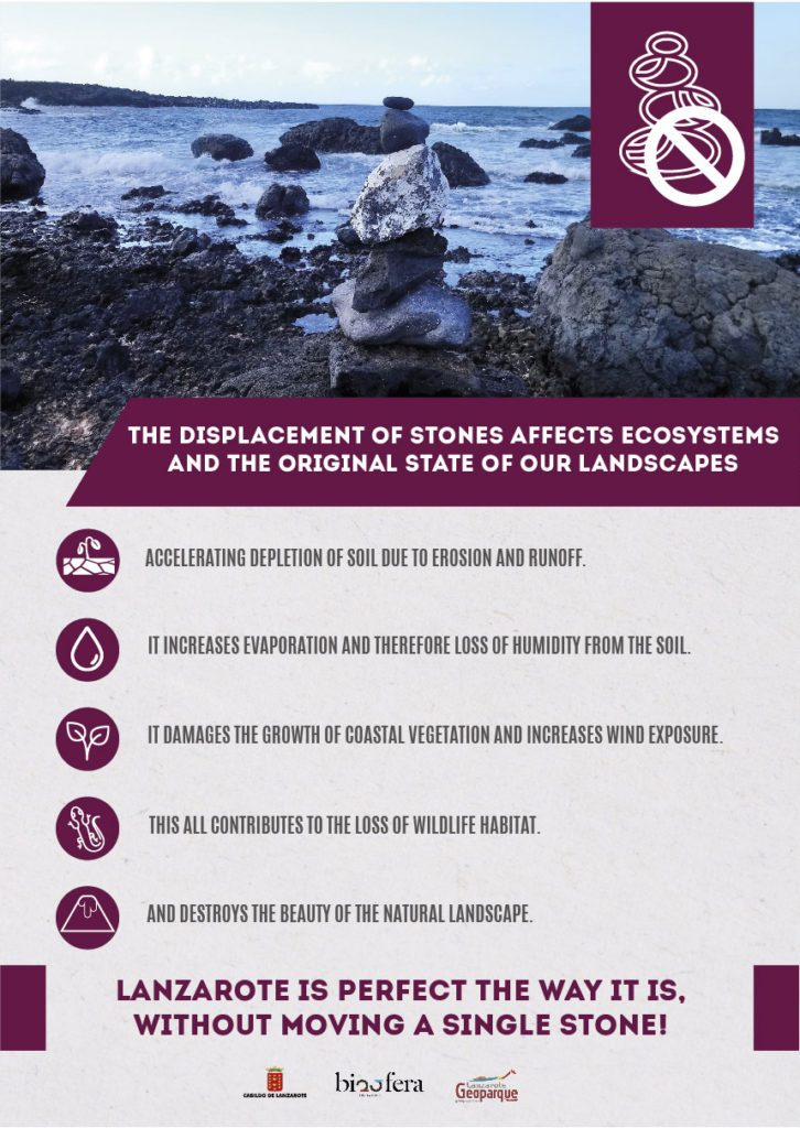 El consejero de la Reserva de la Biosfera, Rafael Juan González Robayna, detalló algunas de las afecciones que tiene sobre el paisaje esta acción de acumular piedras formando estas aparentemente inofensivas figuras, lo que provoca “el aumento de la pérdida de suelo debido a la erosión y la escorrentía; el aumento de la evaporación y por consiguiente la pérdida de humedad del suelo; afecta también al crecimiento de las plantas del litoral y las expone a la acción del viento; modifica el hábitat de la fauna de Lanzarote; y -en general- tiene un gran impacto paisajístico”.