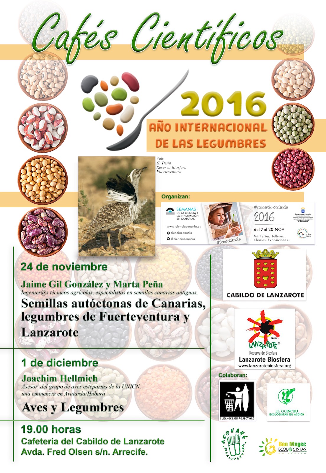 La Oficina de la Reserva de la Biosfera que coordina el presidente del Cabildo de Lanzarote, Pedro San Ginés, organiza este años dos Cafés Científicos dedicados al Año Internacional de las legumbres, el 24 de noviembre y el 1 de diciembre, ambos están previstos a las 19.00 horas en la cafetería del Cabildo de Lanzarote. La entrada es libre.