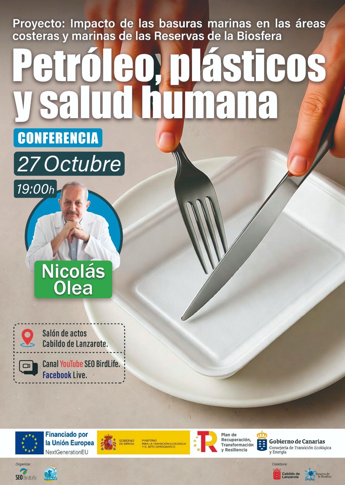 Lanzarote, 23 de octubre de 2025. En el marco de las actuaciones en Reservas de la Biosfera financiadas a través de fondos europeos Next Generation por el Gobierno de Canarias, la asociación SEO/BirdLife Lanzarote ha organizado la conferencia “Petróleo, plásticos y salud humana”, a cargo del catedrático de Radiología y Medicina Física de la Universidad de la Universidad de Granada y médico en el Hospital Clínico Universitario de esa ciudad, Nicolás Olea.