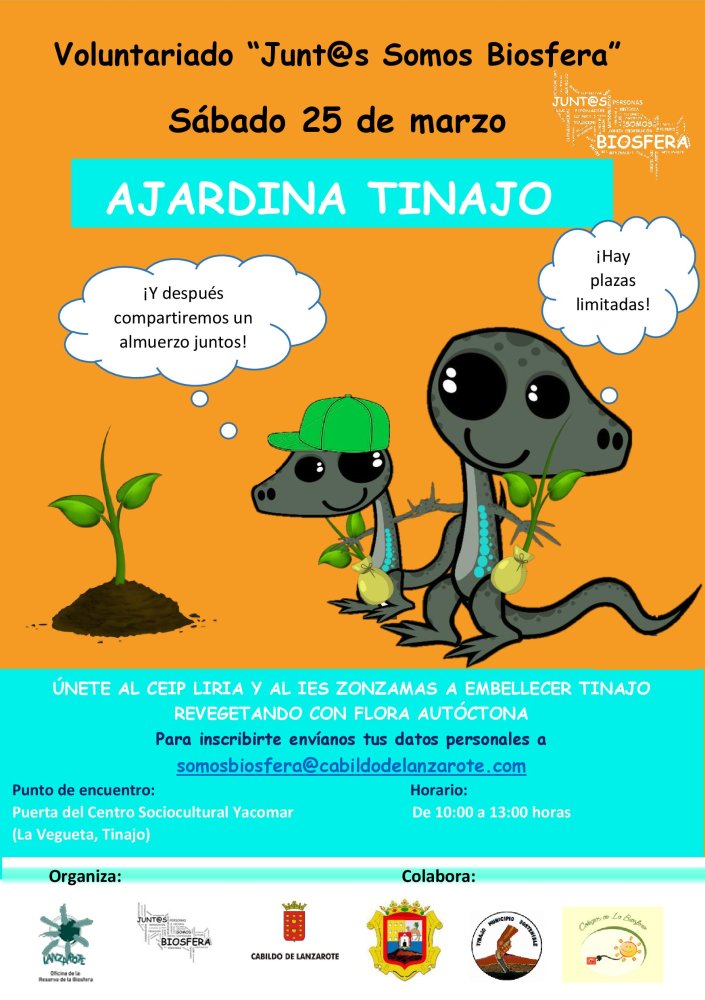 ‘Junt@s Somos Biosfera’ organiza una nueva actividad este sábado, 25 de marzo. En esta ocasión, el equipo de voluntarios y voluntarias que colabora con la Reserva de la Biosfera del Cabildo de Lanzarote, se desplazará hasta el municipio de Tinajo para llevar a cabo una acción de ajardinamiento y embellecimiento con flora autóctona en un solar degradado ubicado en el pueblo de La Vegueta.