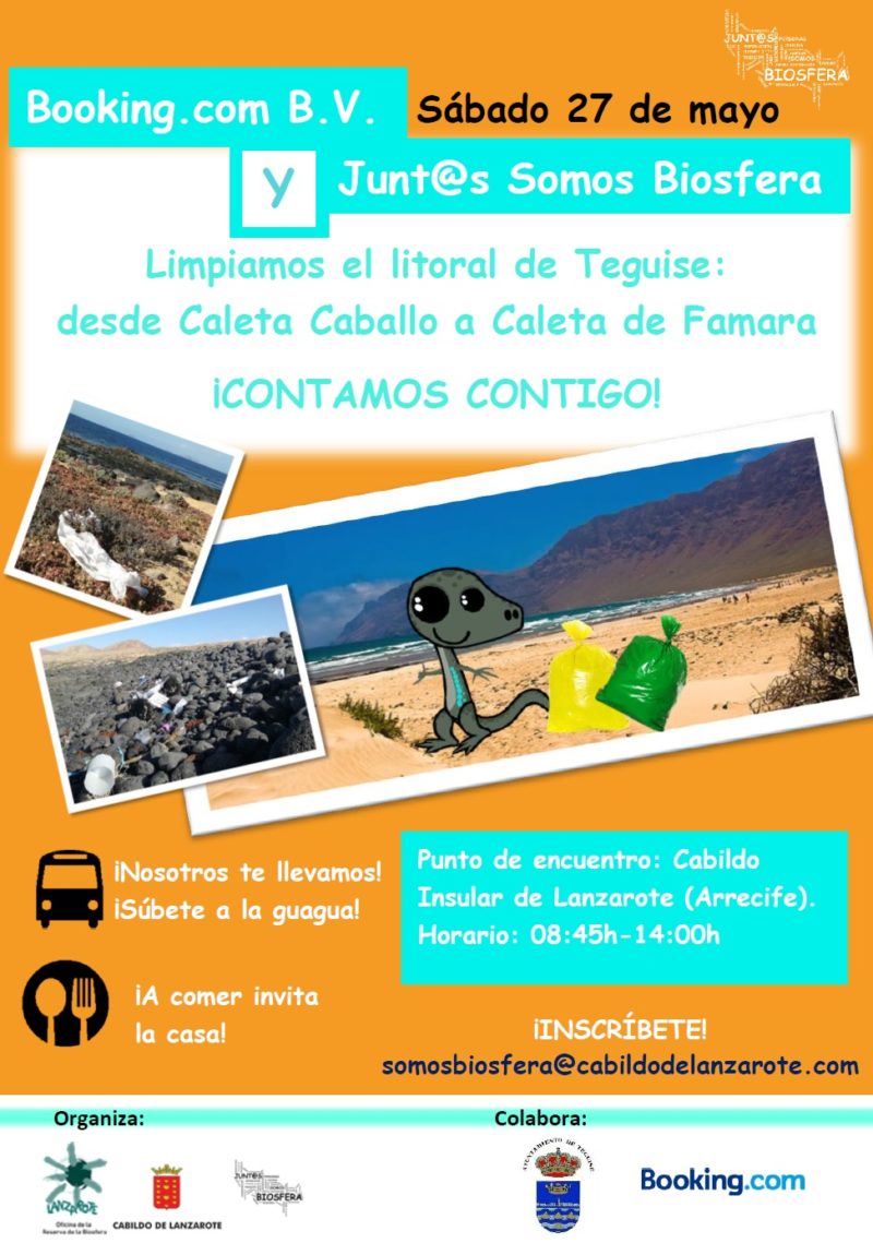 Dentro de las actuaciones y gracias al programa de Responsabilidad Social Corporativa de Booking.com, los empleados de esta entidad internacional junto con el voluntariado de la Reserva de la Biosfera ‘Junt@s Somos Biosfera’ se desarrollará una nueva actuación de limpieza del litoral, playas y espacios naturales de la isla de Lanzarote. Concretamente, la actividad de voluntariado se desarrollará en el litoral del Municipio de Teguise, desde Caleta de Caballo hasta Caleta de Famara, en unos 7 kilómetros de longitud, aproximadamente.