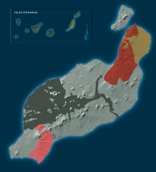 erosión en un edificio volcánico generado por etapas. La mayor antigüedad se localiza en los relieves montañosos, mientras que las erupciones recientes son reconocibles por su tonalidad, alta pedregosidad y ausencia general de arcilla. Su escasa altura y suave relieve (apréciese el aspecto 'lagunar' de las coladas de Timanfaya) no permiten captar la humedad de los alisios, por lo que se dificulta fuertemente el crecimiento vegetal, de modo que, sin apenas obstáculos topográficos ni cubierta vegetal, la Isla resulta trasparente a la mirada. Por ello reconocemos fácilmente el paisaje real en el relieve lunar que simula el ordenador. Por eso resulta tan difícil esconder nuevas edificaciones o resulta tan palpable la suciedad en el campo. |