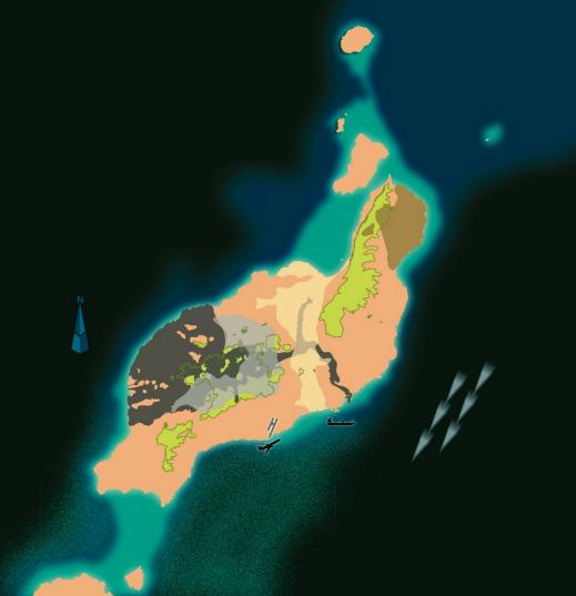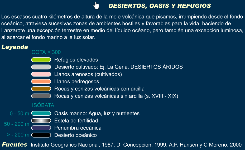 y homogénea en el espacio. Como síntesis de los ambientes naturales que la Isla ofrece, esta lámina plasma mediante colores la alternancia vertical de zonas hostiles y favorables para la vida que se pueden reconocer en la totalidad del edifico volcánico de Lanzarote. Los oasis, marino (color turquesa) y terrestre (verde) en los que coinciden agua, luz y nutrientes, se alternan con desiertos, oceánico (negro) por falta de luz en aguas profundas o de nutrientes en las superficiales; y terrestre por la falta de agua la mayor parte del año (colores pálidos y gris oscuro). No es que falte la vida en los desiertos citados, sino que su valor biológico reside en la diversidad relativa de especies muy bien adaptadas, y no en la biomasa total generada. Adaptaciones como la estrategia migratoria de los atunes, o halcones de Eleonor, que utilizan sus reservas para atravesar esas amplias zonas sin alimento. El oscuro océano se tiñe de vida cuando la corriente fría de Canarias choca con plataformas submarinas y levanta minerales del fondo hacia las aguas superficiales. Así se origina el banco pesquero canario-sahariano y una cierta estela de fertilidad a sotavento de nuestra isla. Algo que también sucede con nuestros vertidos orgánicos en dosis y zonas adecuadas. La vida se adapta al desierto terrestre con mecanismos de ahorro de agua y evitando la excesiva insolación mediante refugios, por ejemplo bajo el suelo, en cuevas y umbrías. Estrategias que adoptaron tradicionalmente los humanos, consiguiendo cultivar el desierto y vivir con razonable confort en sus casas. Hoy, la isla es un oasis vacacional para el turista europeo y un refugio con empleo para la inmigración, gracias a una tecnología y energía fósil que permite llenar de refugios confortables y agua dulce la franja más desértica de la isla. No sin costes ambientales o pérdida de valiosas costumbres. |