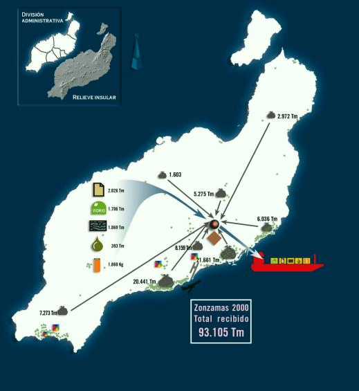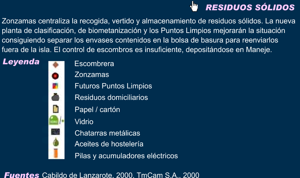 citado por Naredo y Valero, 1999) La humanidad es ya el mayor agente geológico superficial del planeta, movilizando cantidades ingentes de minerales, y usa la mitad del agua dulce disponible. Pero sólo una fracción mínima de esa materia será reciclada y reintegrada a la actividad humana. Todo el resto pasa a ser residuos. Por eso podemos encontrar residuos como la causa de muchos de los grandes problemas que amenazan el medio ambiente o la salud humana y se discuten en reuniones internacionales. Sin embargo, los residuos acaban por traspasar las virtuales fronteras, políticas o administrativas, ya sea impulsados por la gravedad, las corrientes atmosféricas, fluviales o marinas; o por el general deseo humano de no tenerlos cerca. Por eso el agujero de ozono, efecto invernadero, centrales nucleares, derrames de petróleo, Aznalcóllar y el 'mal de las vacas locas' son problemas de residuos. El riesgo más cercano es convertir la propia isla en un sumidero de residuos. Para evitarlo es imprescindible devolver a su origen la máxima cantidad de la basura que generamos y no podemos emplear, o impedir que entren en la Isla materiales no reutilizables ni consumibles. La situación actual permite la retirada parcial y por circuitos separados de recogida voluntaria de vidrio, papel-cartón, chatarras metálicas, aceites de hostelería y pilas-baterías eléctricas. En 2002 se pondrá en marcha la nueva planta de clasificación de basuras domésticas, que seleccionará los envases para su reenvío y fermentará la materia orgánica resultante, a fin de extraer el metano controladamente y con ello producir energía y compost. Además, los Puntos Limpios permitirán la retirada voluntaria y controlada de otros residuos que, por su peligrosidad, volumen, etc., no deben ni pueden depositarse junto a la basura doméstica cotidiana.